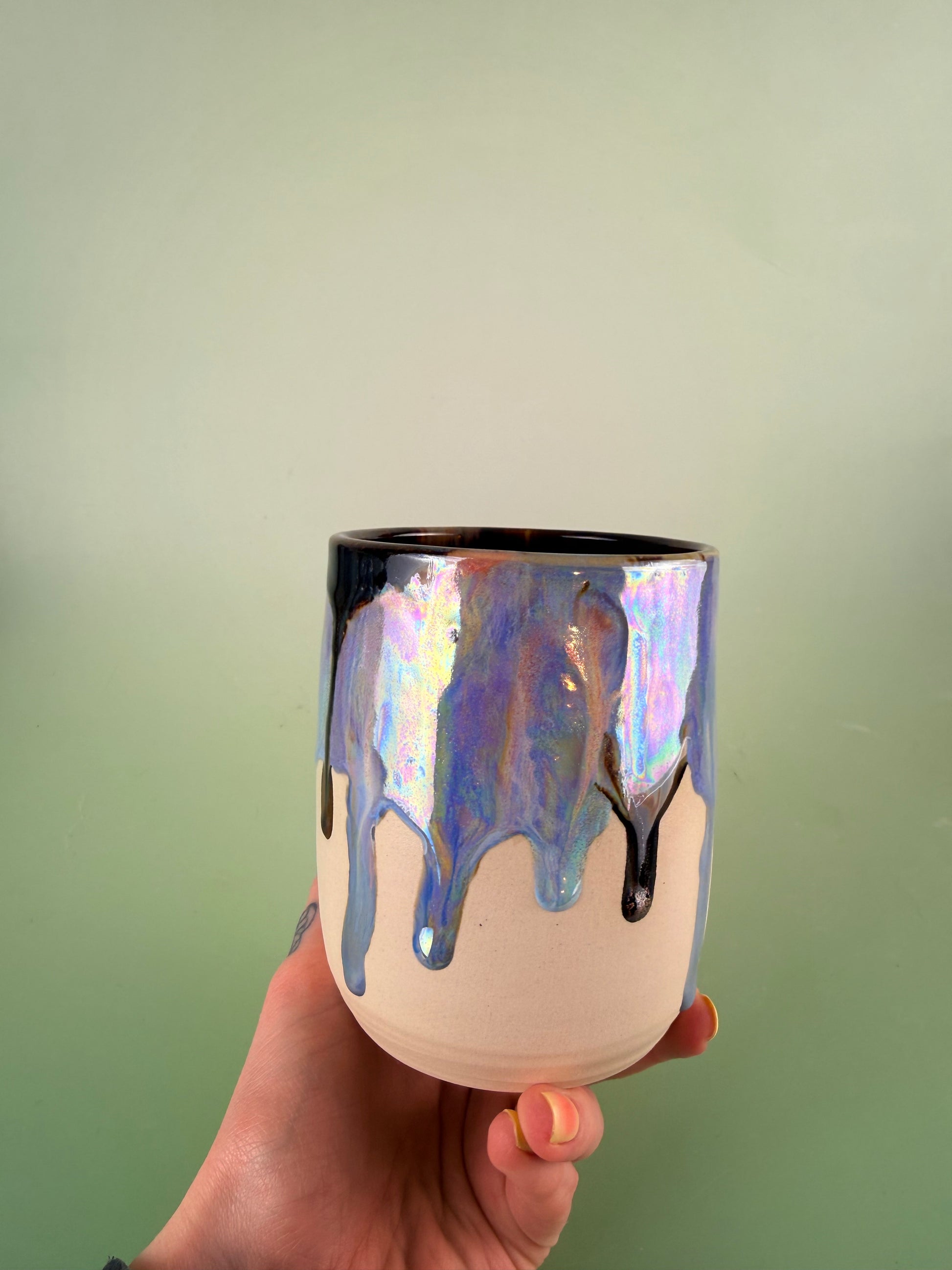 16 oz. 3.25 inches W. 4.5 inches H. Food safe, but not dishwasher safe due to iridescent glaze.
