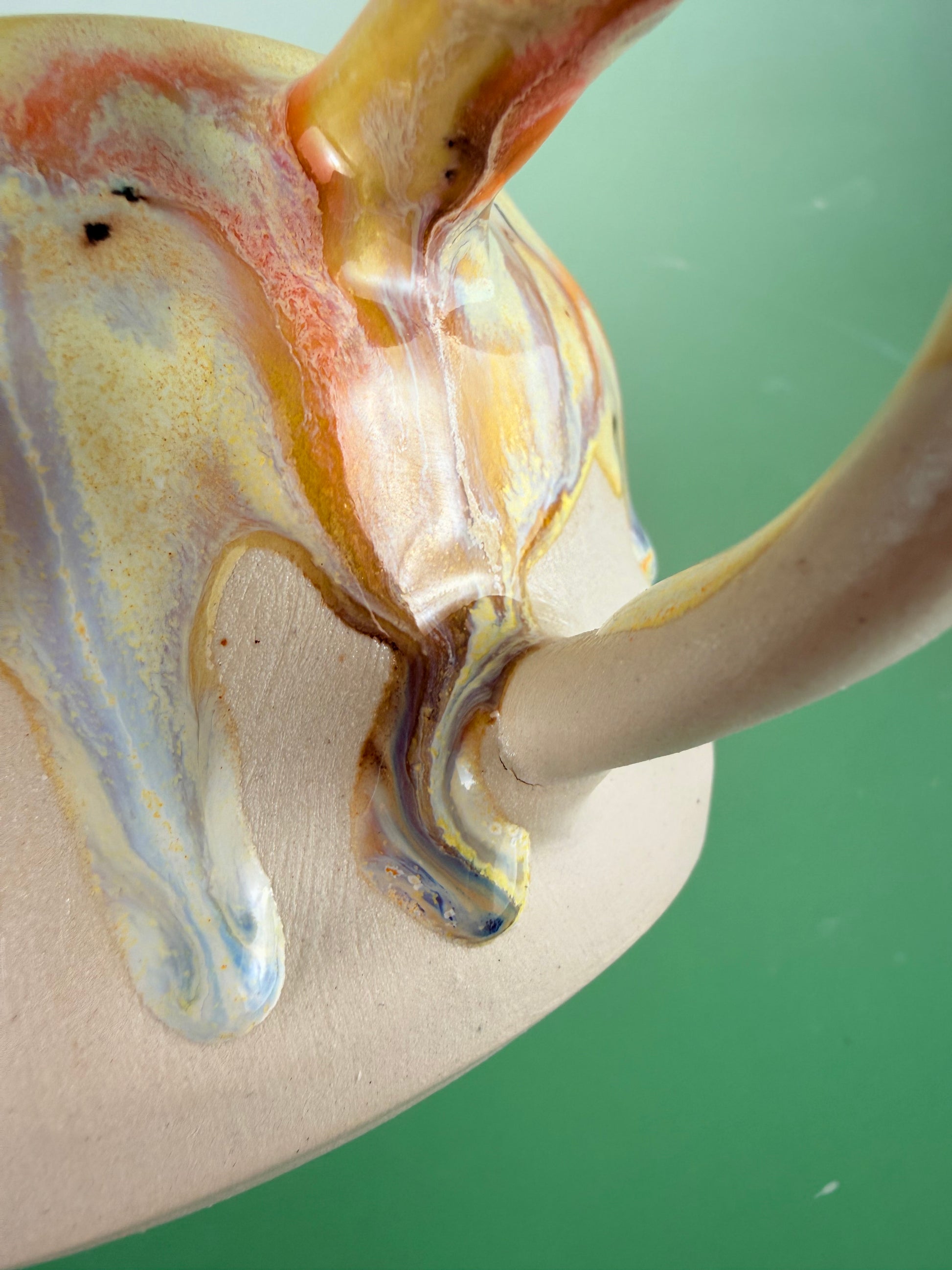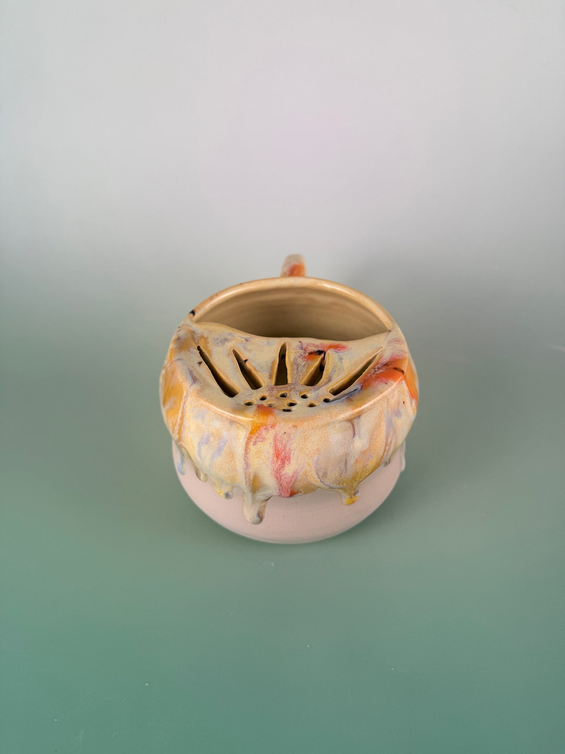 Food safe and dishwasher safe. 4.5 inches W, 3.5 inches H. Discounted due to hairline cracks on the bottom of the handle, it won’t cause any issues but if it does I’ll replace it for free!