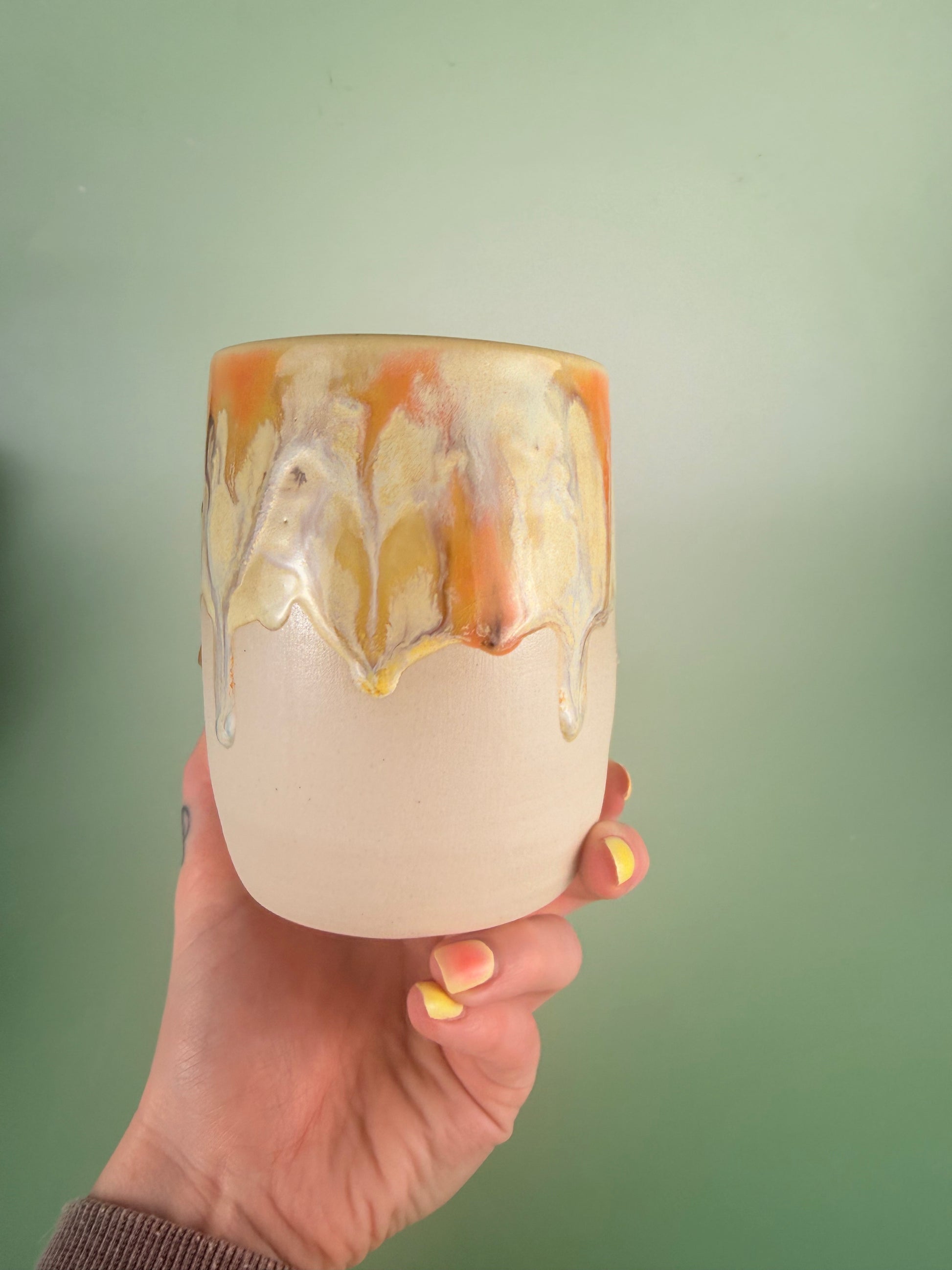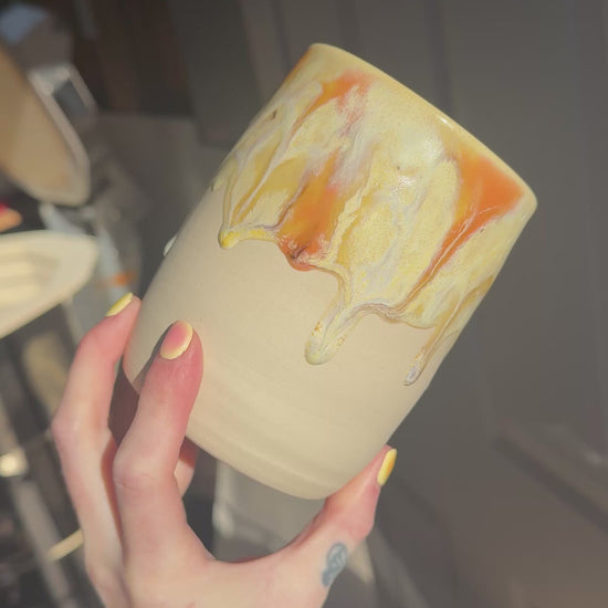 18 oz. 3.5 inches W, 4.5 inches H. Food safe and dishwasher safe. *note there is black glaze mixed in with the yellow lettering